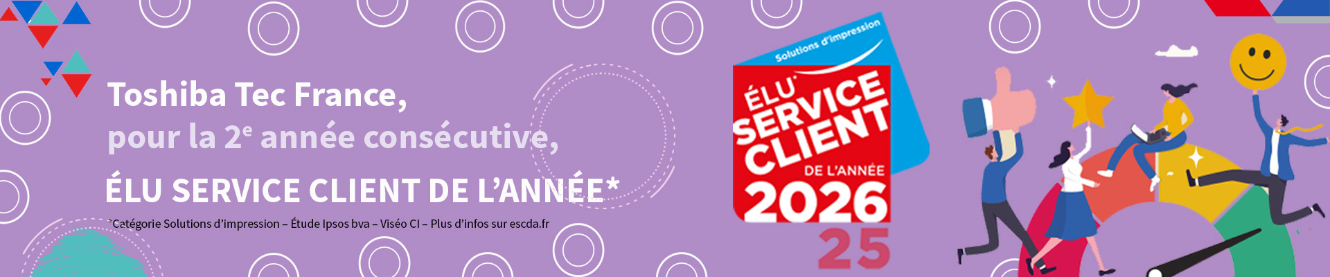 Pour la deuxième année consécutive, Toshiba Tec France a été distingué par le prix Élu Service Client de l’Année* dans la catégorie “Solutions d’impression”. Cette récompense valorise le travail des équipes et souligne l’engagement de l’entreprise à fournir un service de haute qualité, basé sur la réactivité, la pertinence des réponses et la satisfaction des utilisateurs.