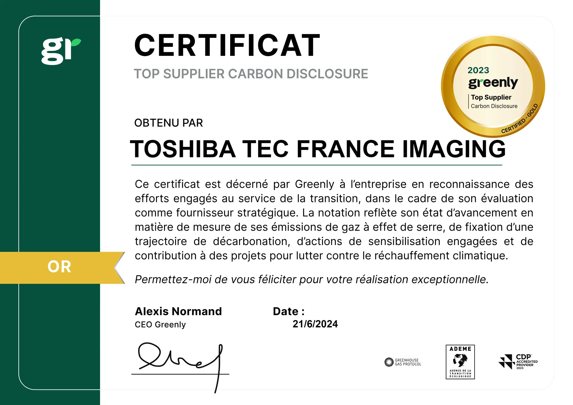 Des mesures ont donc été prises et c’est ainsi que la démarche environnementale de Toshiba Tec en France a été certifiée « Gold – Top green supplier » par Greenly, une plateforme SaaS devenue incontournable en matière de durabilité pour les entreprises qui souhaitent piloter leur stratégie carbone. Greenly a évalué à A le scoring de Toshiba (score entre 75 et 89). Ces résultats reconnaissent les intentions, les engagements et l’efficacité des actions mis en place par Toshiba Tec en France pour diminuer ses émissions carbone.